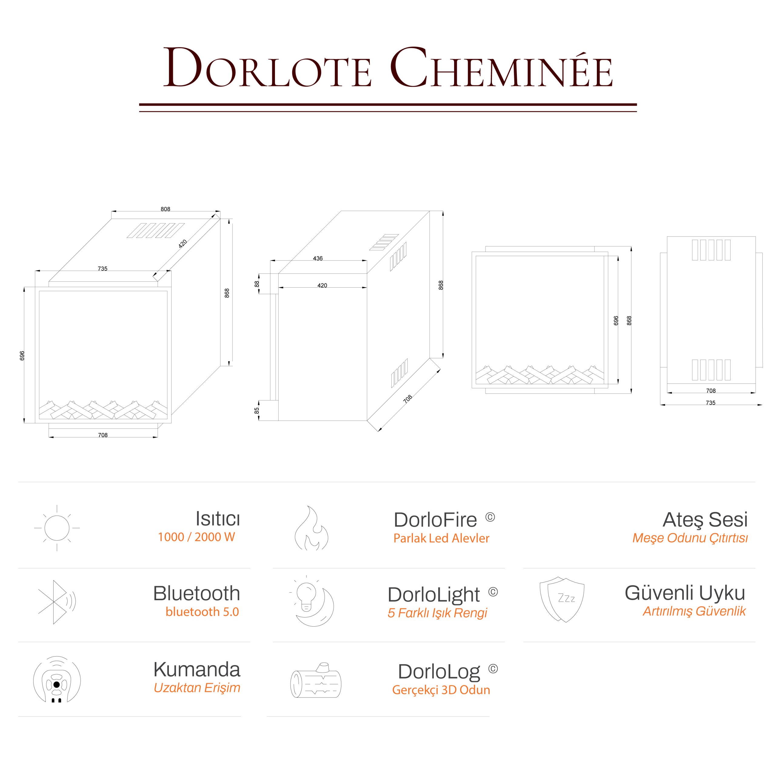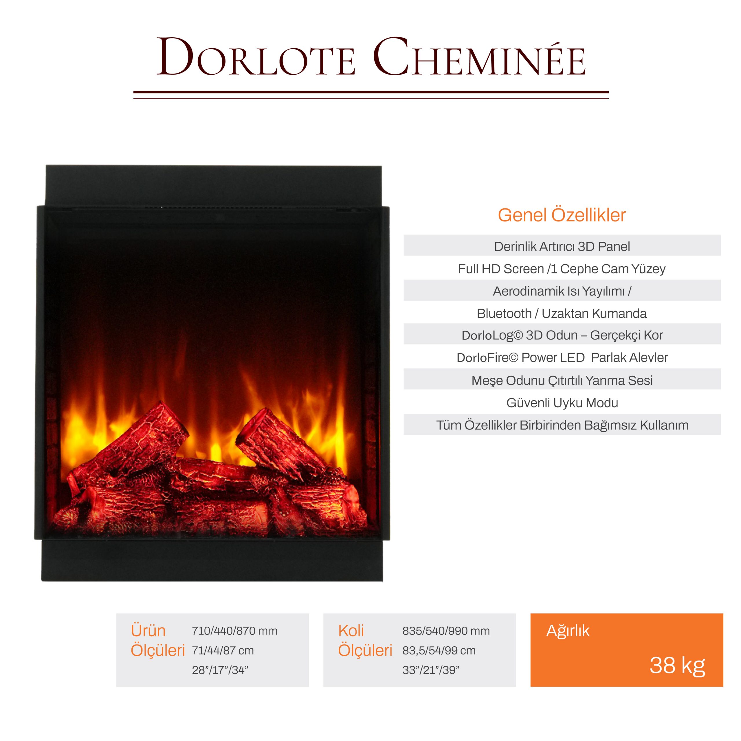 Dorlote Volcano 70 Elektrikli Şömine (Isıtıcılı, Bluetooth)