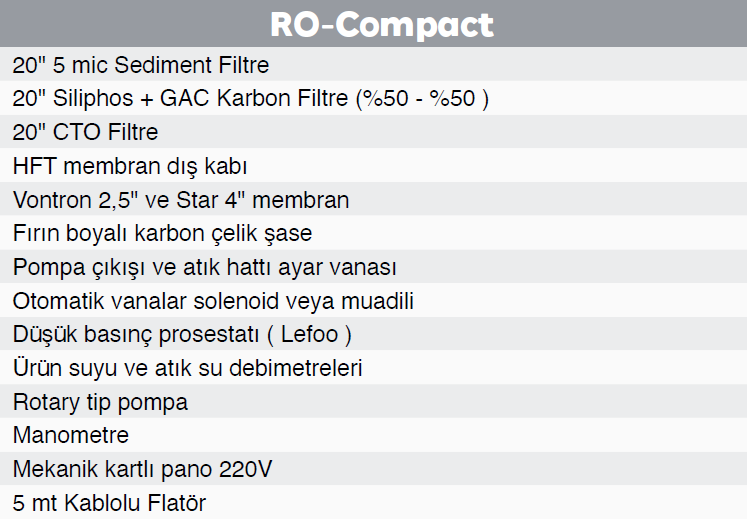 Compact Serisi Reverse Osmosis Sistemleri, su arıtma ihtiyaçlarınızı karşılamak için tasarlanmış yüksek performanslı ve kompakt çözümler sunar. Bu sistemler, sudaki kirleticileri etkili bir şekilde gidererek, temiz ve güvenilir su temin eder. Kompakt yapısı sayesinde her türlü alanda kolayca kullanılabilir ve ileri teknoloji kullanılarak üretilen bu sistemler, uzun ömürlü ve güvenilir performans sağlar.