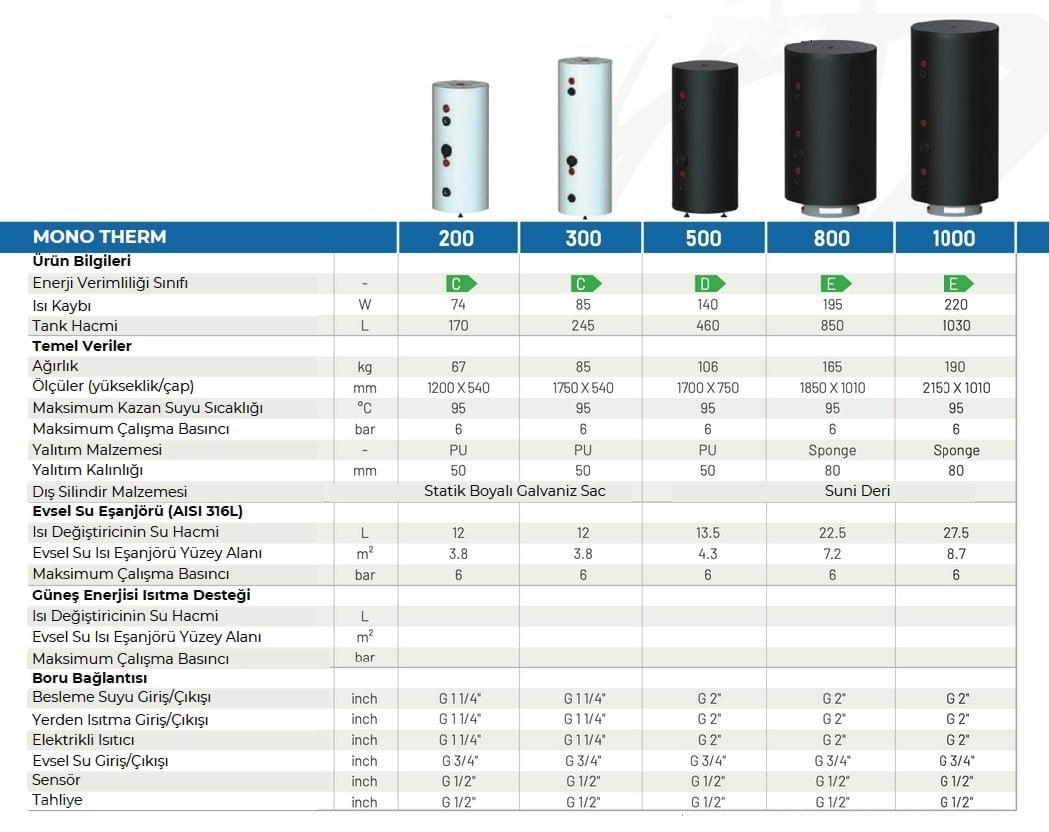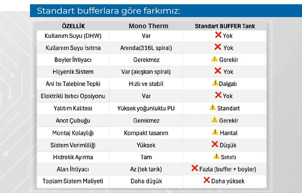 • Mono therm, tampon tankı olarak kullanılabilir. Isı pompası devresi ile ısıtma devresi arasındaki hidrolik ayırımı sağlar, fazla enerjiyi depolar ve ani sıcak su taleplerinde kesintisiz konfor sunar.